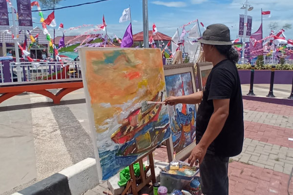 FOTO: Pelukis Tangerang, Lilik Subekti sedang melukis perahu nelayan Desa Ketapang, Kecamatan Mauk, Kabupaten Tangerang di Ketapang Urban Aquaculture.